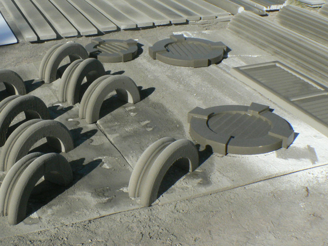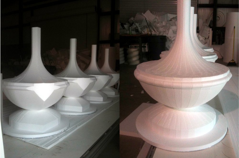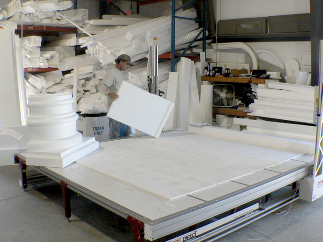 Our sophisticated foam cutting equipment coupled with state of the art CAD software allows us to create any custom foam fabrication you can imagine. For use with interior or exterior applications, the EPS Foam (Expanded Polystyrene) is light weight, yet strong and durable when coated with a layer of cement and then painted.